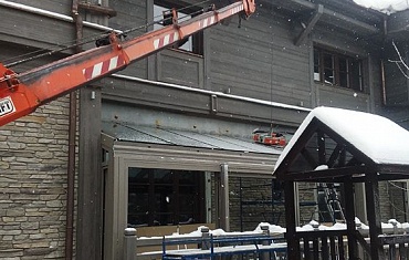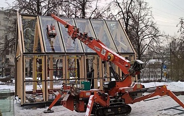 Неизменный тандем мини-крана Jekko SPX 527CDH и вакуумного захвата ARLIFTER GS-750 работал в городе Котельники Московской области на остеклении коттеджа