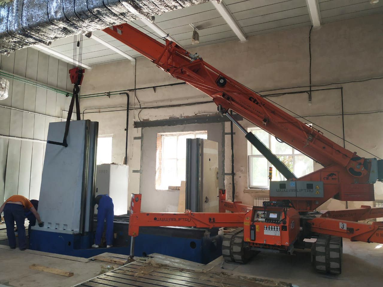 Мини-кран SPX1275 произвел монтаж станка, где вес каждой детали достигал 3-х тонн на одном из производств в Казани. Главная сложность заключалась в том, что завести и установить оборудование необходимо было на очень ограниченном пространстве, на котором также располагался и воздуховод, который еще уменьшал и без того небольшую площадку для монтажа.