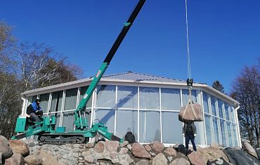 Мини-кран SPX527 помог выполнить работы по ландшафтному дизайну в одном из коттеджных поселков Ленинградской области.