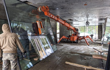 Вакуумный захват Arlifter GS-850 смонтировал несколько крупногабаритных стеклопакетов при плохих погодных условиях на строящейся базе отдыха.