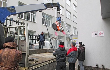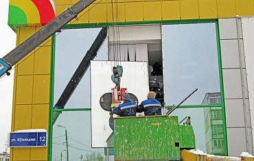 Реконструкция фасада Дворца Молодежи, Екатеринбург. Монтаж стекла весом 1100 кг